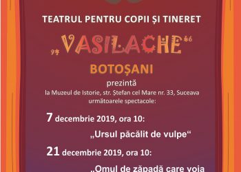 ... Read More → TEATRU PENTRU COPII ȘI TINERET „VASILACHE” BOTOȘANI prezintă la Muzeul de Istorie următoarele spectacole: 7 decembrie 2019, ora 10 „Ursul păcălit de vulpe”, 21 decembrie 2019, ora 10 „Omul de zăpadă care voia să întâlnească soarele” – Bilet de intrare 3 lei