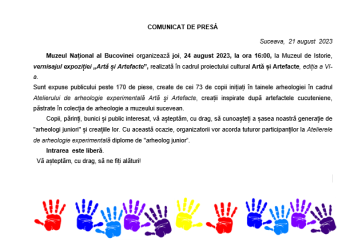 COMUNICAT DE PRESĂ Suceava,  21 august  2023 Muzeul Național al Bucovinei organizează joi, 24 august... Read More → Artă și Artefacte